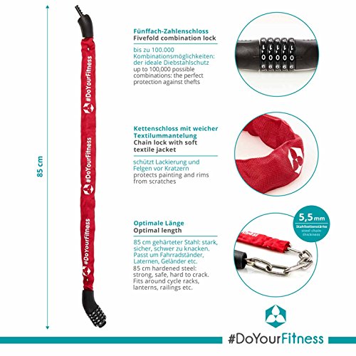 QUALITÀ DEL MARCHIO: Le catene originali »CloseUp« di #DoYourSports sono provviste di un nucleo in acciaio inossidabile temprato di 6 mm e sono testate secondo DIN EN15496:2008. Rispondono perciò alla richiesta attuale di catene da bicicletta contro i furti. Inoltre dal lucchetto a cinque numeri emergono fino a 10000 possibili combinazioni numeriche.