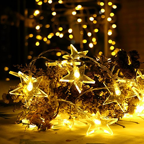 Catena di luci, colore bianco caldo, da interno, con batterie, 30 LED a forma di stella, per albero di Natale, cameretta dei bambini, finestra, tenda