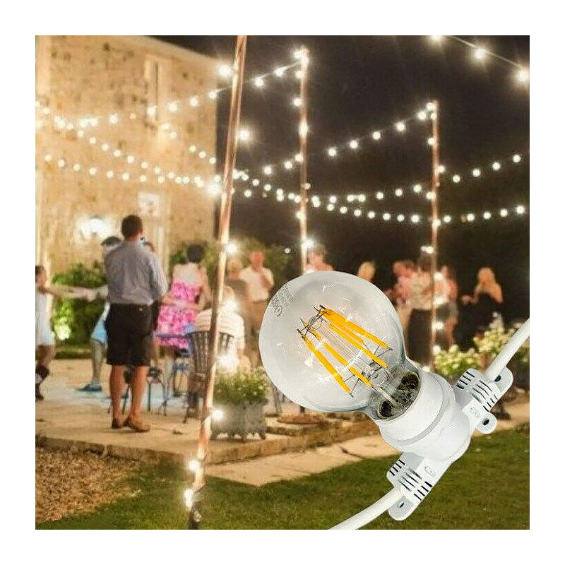 CATENA DI LUCI CORDONIERA LUMINOSA CORDA 11 MT CON PORTALAMPADA E27 CAVO BIANCO Informazioni su questo articolo: Illumina e rendi magiche le tue notti d'Estate in giardino, patio, terrazza o per eventi come matrimoni in ristoranti, sala, bar, b&b e nei tuoi ambienti all'aperto e al chiuso con la nostra magnifica catenaria. La catenaria è lunga 11 metri, di cui 10 luminosi ed 1mt cavo alimentatore (scollegabile per prolungarla) dotata di 10 portalampada (non pendenti) con attacco per lampadine (NON INCLUSE) a LED con attacco E27. Ogni bulbo dista 1 MT dall'altro. Questa catenaria è un'ottima soluzione per uso esterno di giardini, viali, sentieri grazie al suo grado di protezione IP44 che la protegge da schizzi d'acqua (NON SUBACQUEA) La catenaria è dotata di presa schuko ed è prolungabile fino ad un massimo di 8 unità, raggiungendo quindi circa 80 metri per un totale di 600w supportabili tramite i connettori sagni inclusi. Cavo di rame + PVC ritardante di fiamma Colore del cavo Bianco