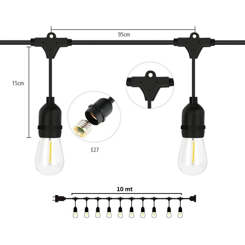 Catena portalampade per esterni e interni con portalampade attacco E27 ideale per esterno, giardino, gazzebbo, allestimento feste ed eventi *Lampadine ESCLUSE Caratteristiche Lunghezza portalampade: 10 metri Lunghezza dal connettore alla spina: 1 metro Colore cavo: nero Sezione cavo: 2x1,5 mm2 Pendenza attacco: 50 mm Grado di protezione: IP65 Portalampade attacco: E27 Numero di attacchi E27: 10 Tipo Spina: 10 A (presa italiana piccola) Tensione: 230Vca/50Hz Colore: Nero e bianco
