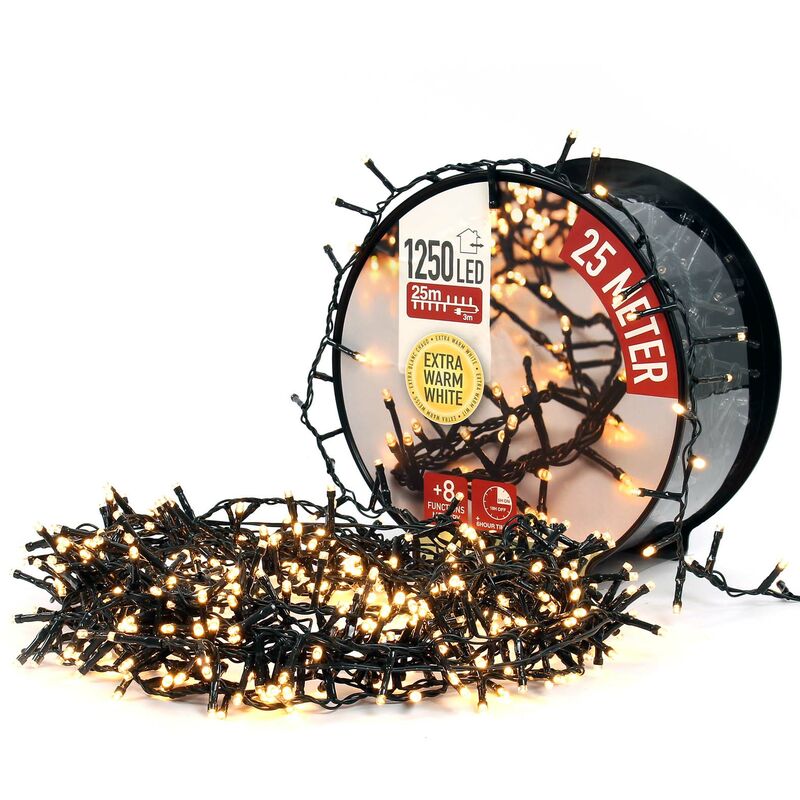 Festone di luci per un effetto luminoso magico 1250 LED diffondono una luce bianca calda Con 8 programmi luminosi, timer e funzione di memoria A prova di spruzzi d'acqua (IP44). per un uso esterno e interno Indicato per l'estate, l'inverno, il Natale, i matrimoni, ecc. La catena luminosa a grappolo Toboli crea un'atmosfera magica e offre incantevoli effetti di luce al buio. Nelle serie di luci a grappolo, i LED sono più ravvicinati rispetto alle catene luminose tradizionali. Pertanto, la ghirlanda di luci è particolarmente luminosa. La serie ha un totale di 1250 LED a risparmio energetico che diffondono una luce bianca calda e accogliente. Quando si attiva il timer integrato, i LED sono accesi per 6 ore e, in seguito, restano spenti per 18 ore. Ciò fa sì che le luci illuminino gli ambienti ogni giorno alla stessa ora. Grazie alla protezione dagli spruzzi d'acqua (IP44), il festone di luci si presta a essere una decorazione sia per interni che per esterni. Illuminare il soggiorno, il