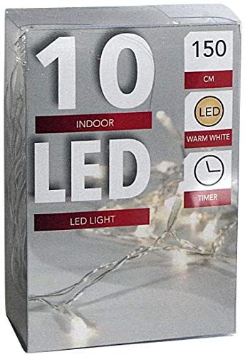 Catena luminosa a 10 LED, funzionamento a batteria, luce bianca calda, timer 6/18, cavo trasparente