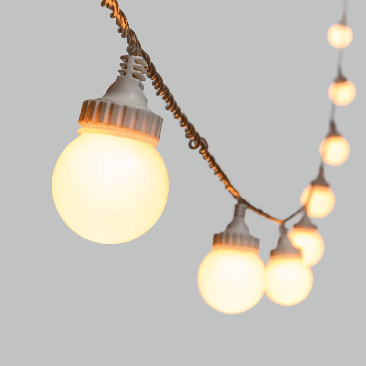 Catena con 10 lampadine LED dal colore bianco caldo, cavo trasparente. Idale per esterno 5m. Adatta all'uso professionale. Idale per feste estive compleanni matrimoni. Grazie al controller è possibile scegliere 8 giochi di luce diversi