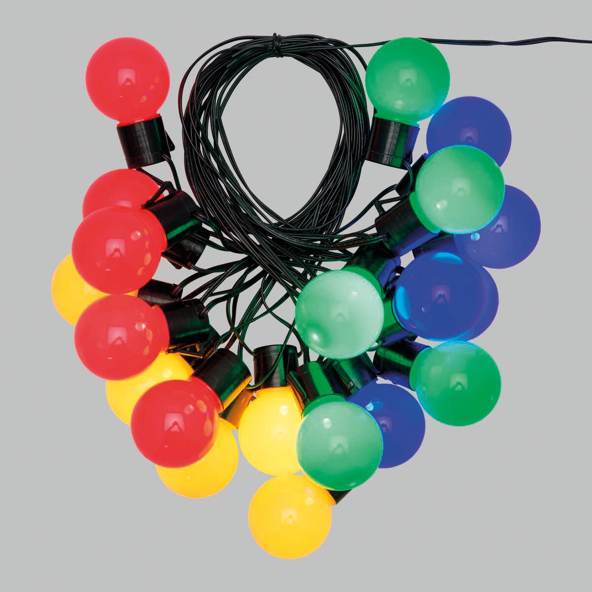 Catena lineare Party Light decorata 20 Lampadine G50 multicolore 20 SuperLED bianco caldo Ø50xH60mm, luce fissa, trasformatore 4,5V, uso esterno, cavo nero, dimensioni 4+10m. Ideale per decorare ambienti esterni porticati alberi di Natale