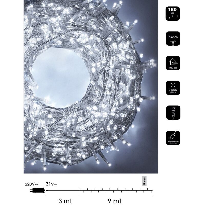 Catena di luci composta da 180 led di 5 mm distribuite in 9 metri di cavo trasparente. Munita di trasformatore e controller con 8 giochi di luci tra cui pure la modalità fissa. Disponibile in diversi colori di luce: bianca fredda, calda, multicolore, rosa, acquamarina e verde acqua. Serie luminose ideali per aree interne ed esterne con grado di impermeabilità IP44. ATTENZIONE: L'alimentatore non può essere collocato sotto la pioggia Catena luminosa LED Natalizia 180 led 9 metri Caratteristiche tecniche Modello Catena luminosa Tensione nominale 220V 31V Grado di protezione IP44 Grandezza led 5 mm Quantità led 180 Trasformatore Incluso Controller 8 giochi di luce Area di installazione Interna-Esterna Colore cavo Trasparente Dimensioni Altezza 5 cm Lunghezza cavo con spina 3 mt Lunghezza catena 9 mt Luce disponibile Bianca-Calda-Multicolore-Rosa-Acquamarina-Verde acqua