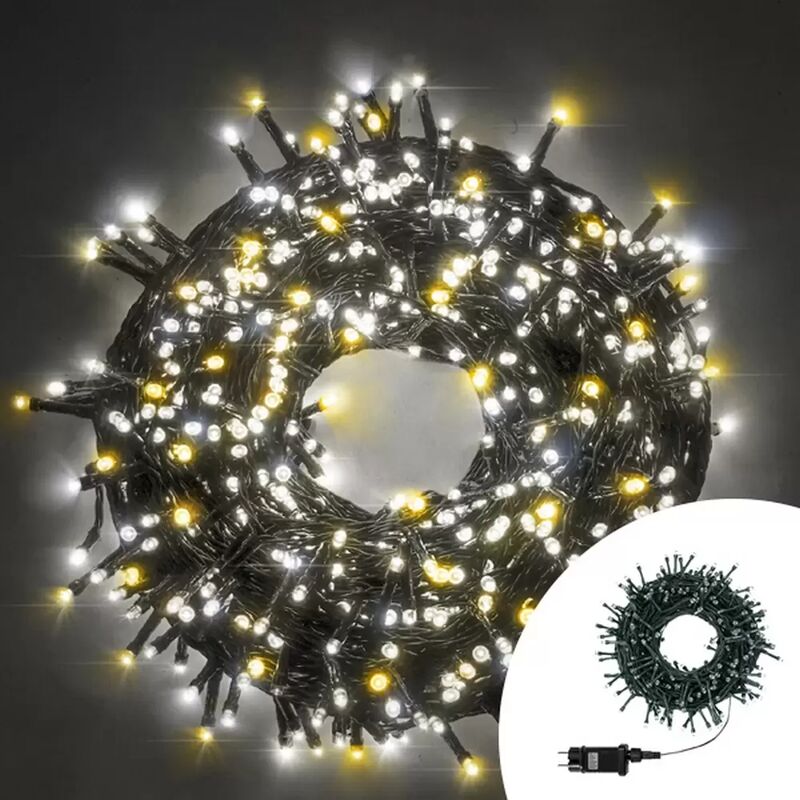 Catena luminosa di Natale a 500 LED con 8 giochi di luce per uso interno e esterno. Catena luminosa di natale con filo verde applicabile in ambienti esterni ed interni. Adatta come decorazione e l'allestimento di case, perfetta anche per addobbare giardini, gazebi e spazi all'aperto grazie al suo grado di protezione IP44. Munita di trasformatore e controller con 8 giochi di luci tra cui pure la modalità fissa. SPECIFICHE TECNICHE Numero di LED: 500 Consumo: 6W Colore luce: bianca e calda Lunghezza cavo: 3 mt Lunghezza catena: 25 mt Grado di protezione: IP44 Peso: 0,50 g