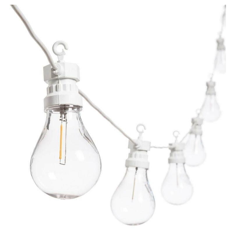 tuttavia la catena, quando è appesa, va sempre fissata a un cordino. La presenza di occhielli integrati al cavo facilitano l'applicazione. La decorazione è a bassa tensione, assicurata dal trasformatore collegato al cavo di alimentazione lungo 5 metri. Grazie ai connettori presenti alle estremità di ciascuna catena, è possibile collegare più segmenti e alimentarli con un unico cavo di alimentazione. Accorgimenti d'uso: Questo articolo decorativo è pensato per allestimenti esterni temporanei, in occasione ad esempio di party estivi. Lampadine di plastica sostituibili. Nell'installazione all'aperto la catena deve sempre essere appesa ad un cordino di acciaio (non fornito). Specifiche Tecniche: Lampadine in plastica Luce fissa Prolungabile Cavo di alimentazione 5 m incluso Appendere la catena ad un cordino di acciaio Uso interno ed esterno Dimensioni Disponibili: 10 Lampadine 10 mt di cavo 20 Lampadine 15 mt di cavo Diametri Lampadine