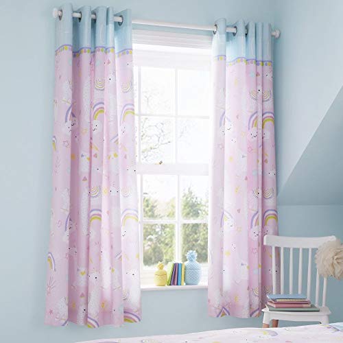 Un design illustrativo su uno sfondo rosa con un smattering di glitter e un adorabile llama-corn adatto con un facile da appendere tende con occhielli e completamente foderato per garantire un sonno riposante