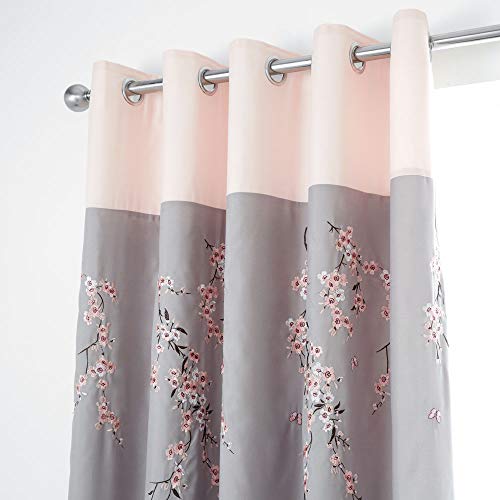 Bella lucentezza rami Pink Cherry Blossom sono ricamati su un morbido tessuto di raso sfondo munito di un facile da appendere tende con occhielli, queste tende sono completamente foderato per creare un elegante drappeggio