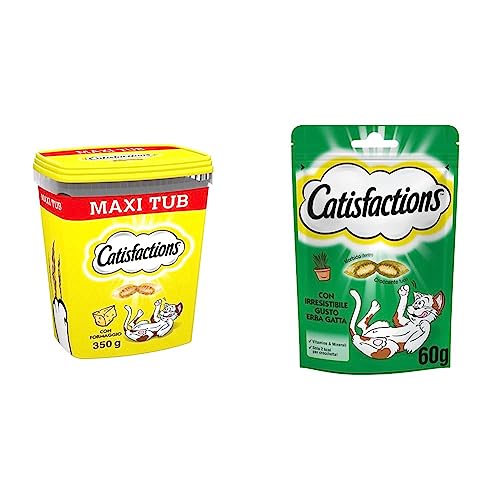 Catisfactions Snack per gatto, Formato Scorta 700g al gusto Formaggio, 2 Maxi Tub da 350gr ciascuno & Snack per Gatto, con Irresistibile Erba Gatta, 6 Confezioni da 60g, Verde, 60 g