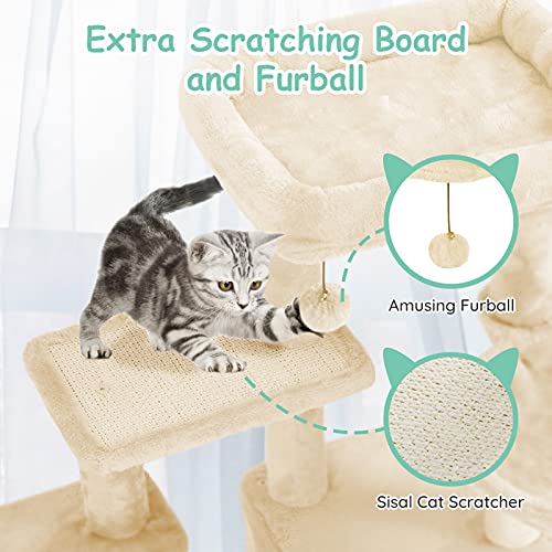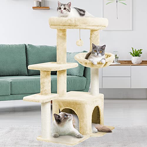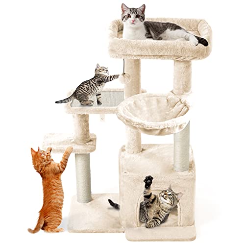 Albero per gatti multiuso: l'albero per gatti CatRomance presenta più livelli, ognuno con una serie di strutture e attività interessanti, offre un salto e un balzo senza fine. La torre per gatti è alta 89,9 cm, viene fornita con un tiragraffi e pali rivestiti in sisal per molteplici possibilità di graffio. Un accogliente cubby per pisolino e un giocattolo palla penzolante sia addolcire l'albero del gatto. La base è abbastanza grande 58,9 x 40,9 cm.