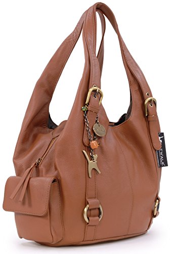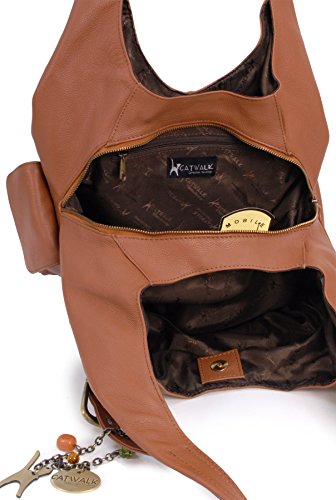 Catwalk Collection Handbags - Vera Pelle - Borsa a Spalla/Borse a Mano - Con Ciondolo a Forma di Gatto - Alex - MARRONE CHIARO
