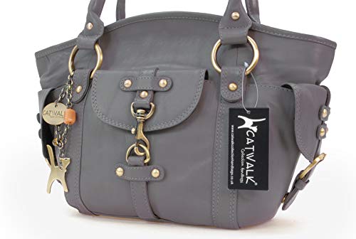 Catwalk Collection Handbags - Vera Pelle - Borsa a Spalla/Borse a Mano - Con Ciondolo a Forma di Gatto - Karlie - GRIGIO
