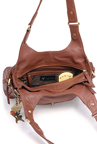 Catwalk Collection Handbags - Vera Pelle - Borsa a Spalla/Borse a Mano - Con Ciondolo a Forma di Gatto - Roxanna - MARRONE CHIARO