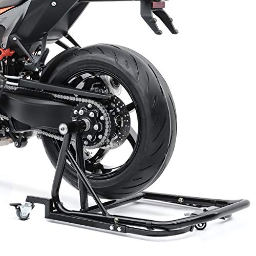 Anche pronto per utilizzarlo come un supporto moto (doppie rotelle per il cavalletto moto incluse). Incluso l'adattatore specifico al modello (perno sostenuto da cuscinetti)