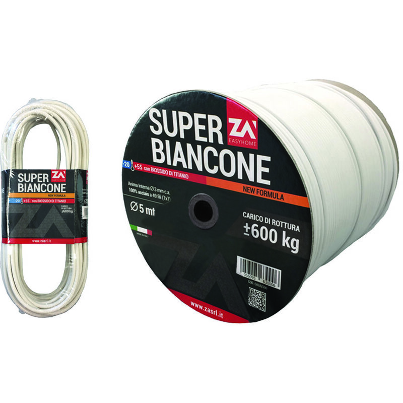 In acciaio zincato 49 fili (7x7) - rivestito in pvc bianco con biossido di titanio - resistente ai raggi solari - tenuta MAX Kg.600