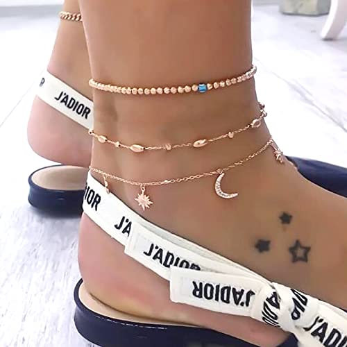 Cavigliera a forma di stella di luna Cavigliera in cristallo con perline Bracciale Boho Catena a strati da spiaggia Gioielli regolabili per donne Ragazze adolescenti