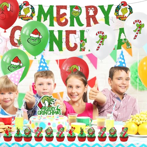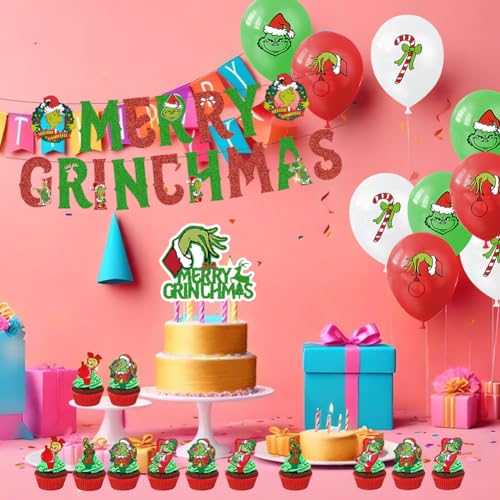 CBOSNF Grinch Decorazioni di Compleanno Hilloly 32 Pezzi Decorazioni per Feste a Tema Natale Merry Christmas Banner Cake Topper Grinch Palloncini in Lattice Grinch Party Supplies per Bambini