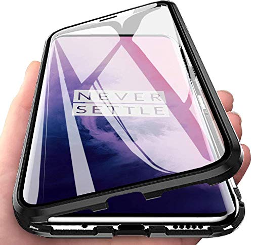 CCENJOY Cover per OnePlus 6T/OnePlus 7, Adsorbimento Magnetico Paraurti in Metallo con 360 Gradi Protezione Case Doppi Lati Trasparente Vetro Temperato Flip Custodia(Nero)