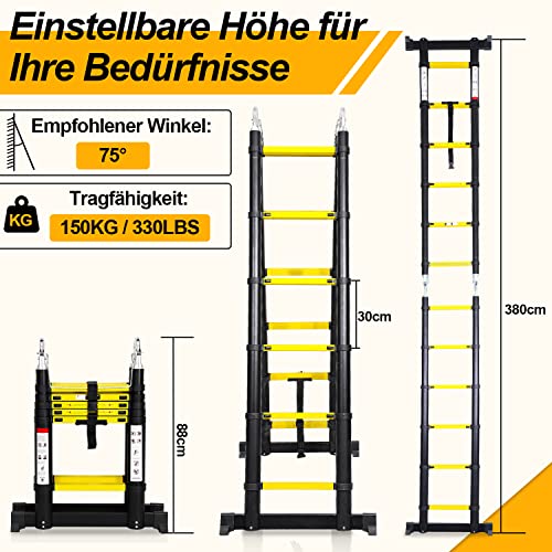 Cecaylie - Scala telescopica da 3,8 m (1,9 + 1,9), antiscivolo, multifunzione e portatile, in alluminio, portata massima 150 kg (nero)