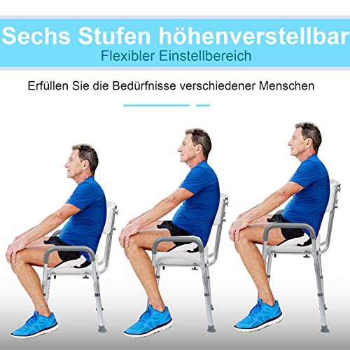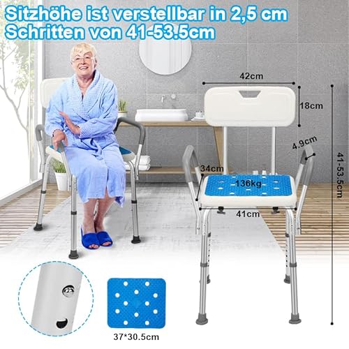 【Sedia da doccia durevole】Con telaio esterno in lega di alluminio, resistente alla corrosione, polietilene ad alta densità, larghezza della seduta 41 cm, profondità 34 cm, carico massimo di sicurezza: 150 kg, peso: 12,4 kg.