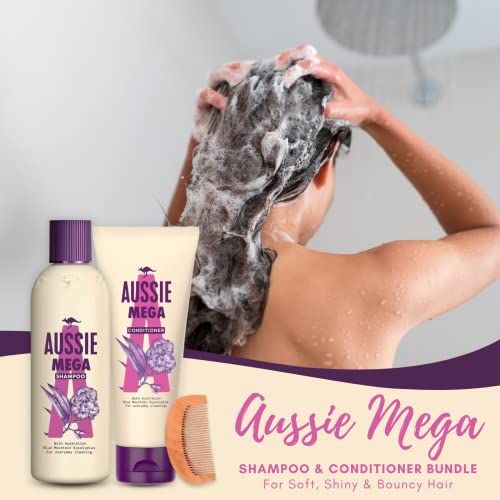 Ceces Home & Garden Mega Aussie - Set di shampoo e balsamo con 1 shampoo Mighty Mega da 300 ml, balsamo da 250 ml, pettine curvo per capelli in legno - per super morbido, rimbalzante e pieno di