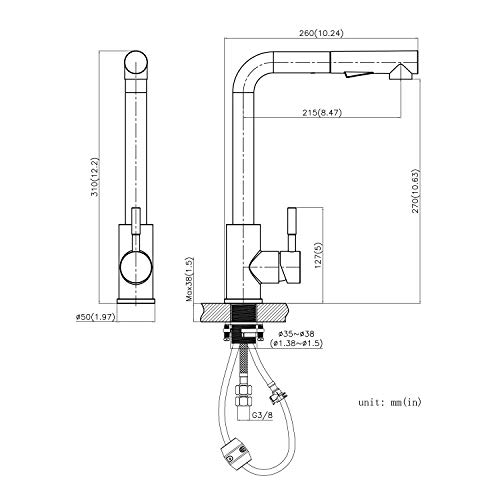 INSTALLAZIONE FACILE: Installazione a foro singolo, foro di montaggio: ø35-38mm. Spessore della piastra di montaggio applicabile: 1-40 mm. 2 tubi flessibili da 50 cm e attacco universale G3/8. Tutti gli accessori necessari sono inclusi e puoi installare il lavabo da solo in pochi semplici passaggi.
