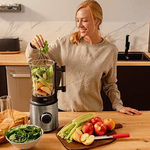 Vaso Blender con acciaio inossidabile finisce con un massimo di 2700 W di potenza equivalente a 2,4 CV di potenza, il che raggiunge rapidamente un perfetto schiacciato. Inoltre, ha una tecnologia brevettata totale che consente al movimento di counter -bass delle lame di schiacciare anche il cibo più duro senza sforzo.