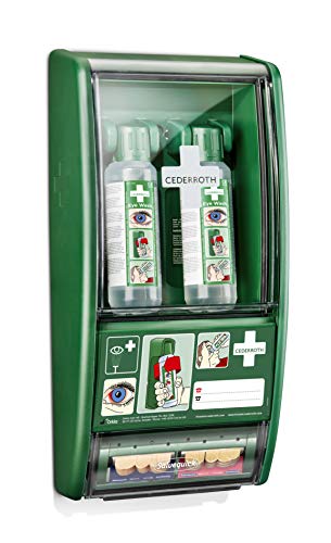 La stazione di lavaggio oculare Cederroth contiene 2 lavaggi oculari Cederroth da 500 ml. Anche il dispenser di cerotti Salvequick contenente cerotti tessili e plastici è incluso con la stazione di lavaggio oculare.