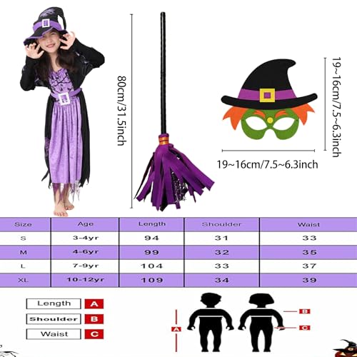 CEHNCEH Halloween Costume da Strega per Bambina, Vestito Strega Bambina con Gonna da Strega, Cappello, Scopa della Ttrega e Maschera, Costumi da Strega per Decorazioni Cosplay Feste di Carnevale (L)