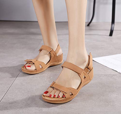 CELANDA Open Toe Sandali Donna Premium Ortopedico Sandali Estivi Comode Cuoio Sandali con Zeppa Vintage Sportivi Sandali Scarpe da Spiaggia Marrone 39 EU