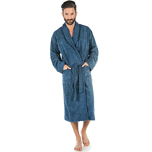 CelinaTex Oregon Accappatoio Collo Sciallato A Tinta Unita Lungo Tasche Applicate Cuciture Decorative Donna Uomo Unisex Puro Cotone XXL blu