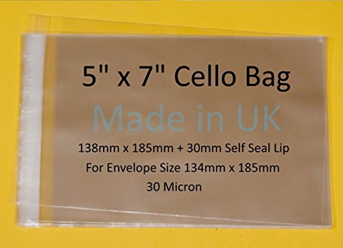 Pack of 500 - 5 X 7 - Cellophane Greeting Card Display Bags 30 Micron Self Seal - 138mm x 185mm + 30mm Flap