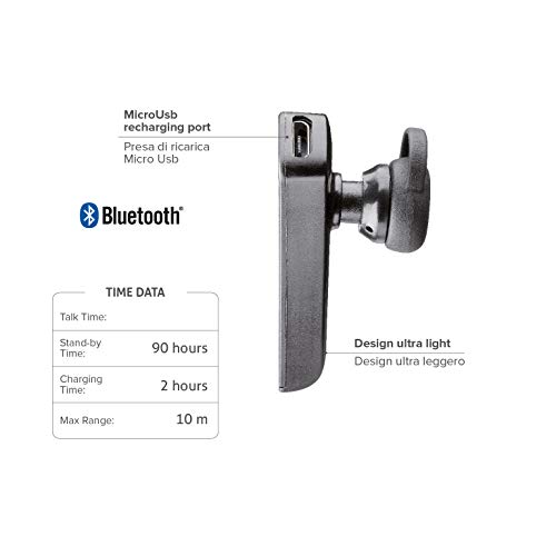 la confezione Include: l'Auricolare Cellularline Mono Bluetooth, due supporti retro auricolare, 3 gommini di cambio (S, M, L), un cavo di ricarica MicroUSB e le istruzioni d'uso