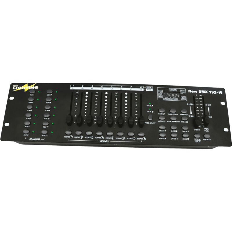 Centralina professionale DMX per teste mobili, faretti da 192 canali funzione WI-FI con batteria interna ricaricabile La centralina N.LIGHTING è un controller DMX concepito per la gestione nel mondo dello spettacolo di teste mobili, faretti, barre LED con possibilità di salvare le impostazioni dei programmi conservando la praticità di programmazione delle unità di controllo più compatte. La centralina che proponiamo è una vera e propria novità, dispone di 16 slider (cursori) e vari slot per poter memorizzare a tuo piacimento il programma scelto da te. Con questa centralina si possono collegare massimo 12 scanner.Oltre alle innumerevoli funzioni troviamo anche il cursore speed per regolare la velocità della luce e il cursore time per impostare la durata di tempo della scena. La centralina N.LIGHTING inoltre può funzionare anche col WI-FI grazie all'antenna con segnale di 2,4 GHZ e con la batteria interna ricaricabile. Le funzionalità della centralina sono le seguenti: Automatica