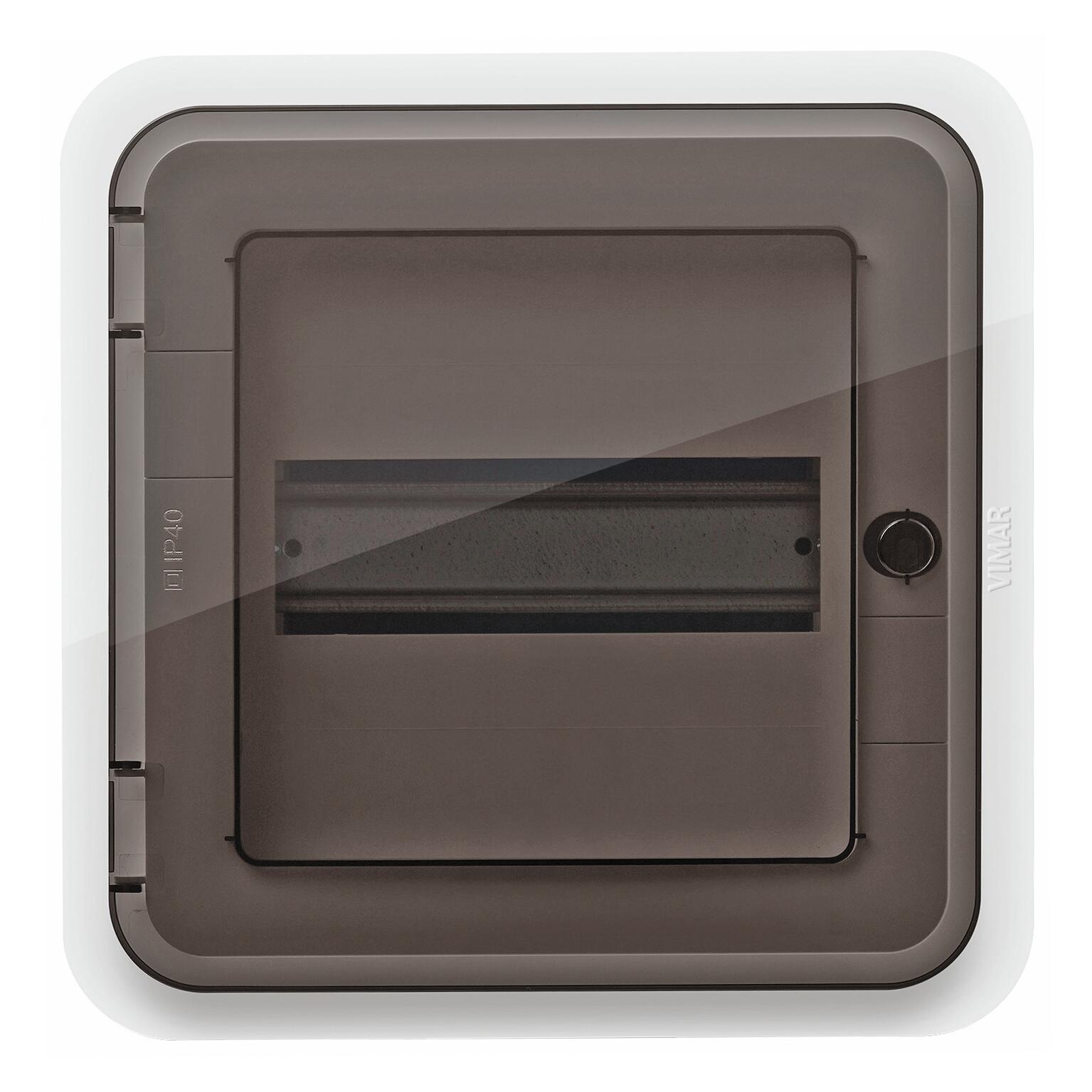 IP40, completo di guida DIN (60715 TH35), portello colore fumé, completo di scatola da incasso per pareti in muratura. Chiusura con blocchetto magnetico fornito di serie per preservare la linearità e l'omogeneità del design. La perfetta simmetria della cornice e della scatola consente di avere una sola porta del centralino, che può essere aperta sia da destra che da sinistra, semplicemente ruotandola. Possibilità di inserire la serratura con chiave