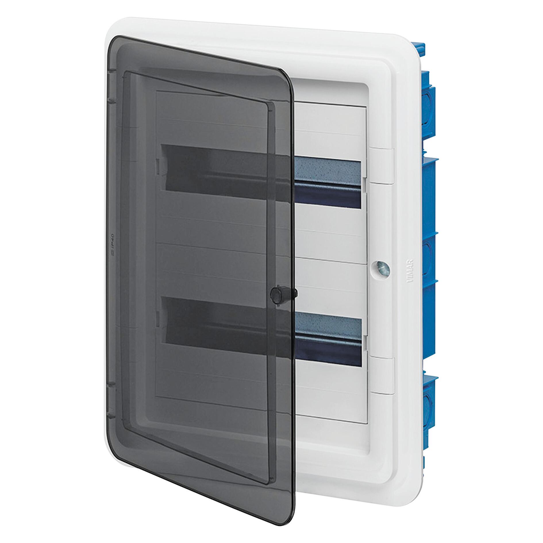 IP40, completo di guida DIN (60715 TH35), portello colore fumè completo di scatola da incasso per pareti in muratura. Chiusura con blocchetto magnetico fornito di serie per preservare la linearità e l'omogeneità del design. La perfetta simmetria della cornice e della scatola consente di avere una sola porta del centralino, che può essere aperta sia da destra che da sinistra, semplicemente ruotandola. Possibilità di inserire la serratura con chiave
