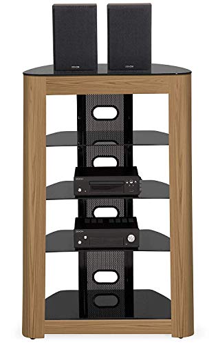 5 ripiani con ripiani regolabili in altezza in vetro nero lucido Hi-Fi AV rack con fascia in legno di rovere lucido - Progettato per durare nel tempo, Zinnia ha una struttura in metallo robusta e rigida.