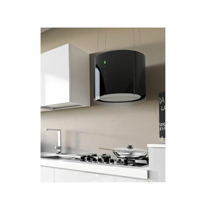 Falmec Eolo E.ion. Potenza massima di estrazione: 450 mⁿ/h, Tipo di estrazione: Filtrante, Rumorosità (velocità bassa): 56 dB. Tipo: Cappa aspirante a isola, Colore del prodotto: Nero, Materiale della scocca: Vetro. Tipo di filtro antigrasso: Carbonio. Potenza motore: 140 W. Larghezza: 450 mm, Profondità: 450 mm, Altezza: 365 mm