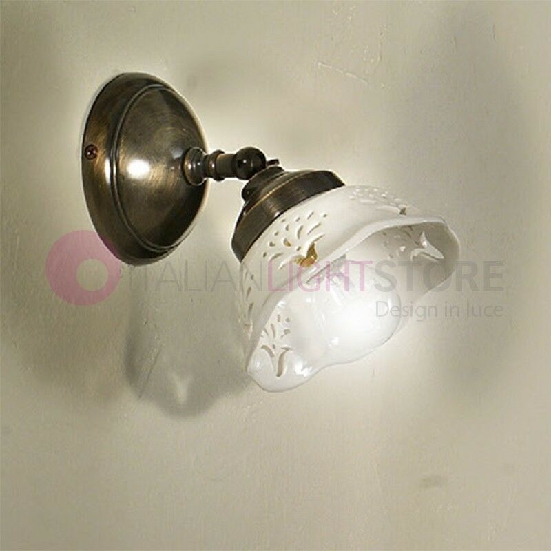 Lampada da parete in ottone con diffusore orientabile in ceramica bianca traforata. Lampada da parete applique regolabile realizzata in ottone e ceramica bianca lucida traforata, in stile classico rustico country, collezione Riparbella di Ceramiche Borso . La lampada abbina una montatura in ottone anticato spazzolato ad un originale diffusore in ceramica bianca lucida con decorazoni traforate, grazie ad uno snodo è possibile orientare la luce (ideale per illuminare particolari angoli o specchiere). La collezione di lampadari in ceramica Riparbella è ispirata al passato e ripropone materiali classici come ceramica e ottone, sapientemente lavorati da artigiani secondo antiche tradizioni.Comprende il saliscendi, le lampade a sospensione e a plafoniera, le appliques a parete, i bilanceri e le lampade da tavolo (VEDI CORRELATI). Produzione 100% Made in Italy. Dimensioni: dffusore D. 13 cm, base a muro d. 10 cm. Illuminazione diretta orientabile Elettrificazione: 1 x E14 max 40W Lampadina