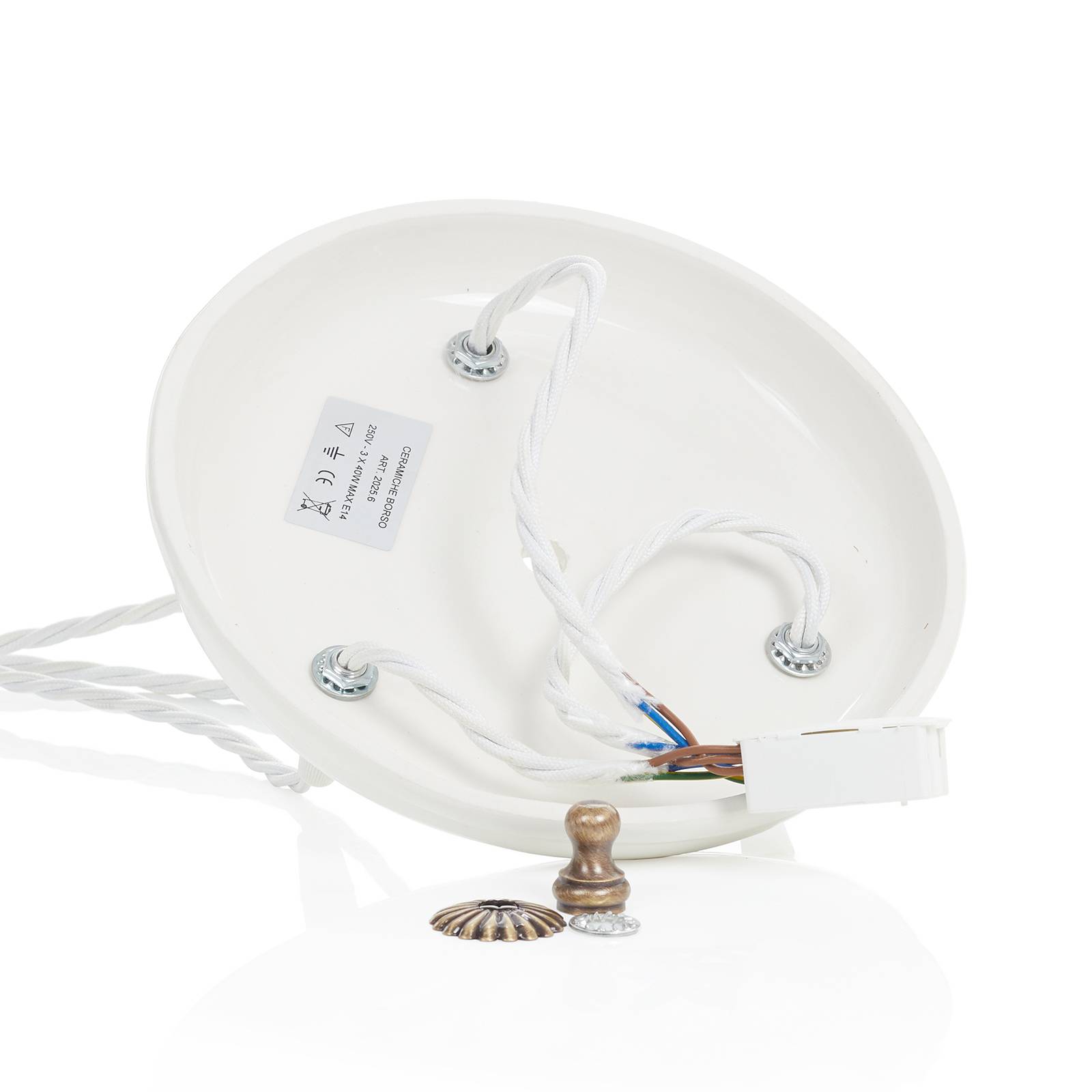 Per ore romantiche: Lampada a sospensione NONNALa lampada a sospensione a 3 luci si ispira allo stile della casa di campagna. Il motivo floreale traforato sul paralume in ceramica bianca è circondato da bande decorative blu sui bordi. Un rosone nello stesso stile e la ciotola in metallo in ottone vecchio completano l'aspetto romantico. La lampada funziona con tre lampadine da 40 watt. Il motivo traforato crea effetti di luce efficaci, mentre i paralumi larghi 14 cm dirigono la luce verso il basso. La sospensione massima di 104 cm lascia aperte molte possibilità.Un apparecchio versatileLa ceramica bianca si abbina perfettamente ai mobili in legno e completa facilmente lo stile classico degli interni. La lampada aggiunge quel qualcosa in più a un tavolo in legno o a un elegante tavolo in vetro.