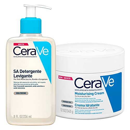 CeraVe SA Detergente Levigante Pelli Molto Secche Ruvide e Screpolate Azione Esfoliante con Acido Salicilico e 3 Ceramidi 236ml + Crema Idratante Viso e Corpo Pelli Secche e Molto Secche 340g