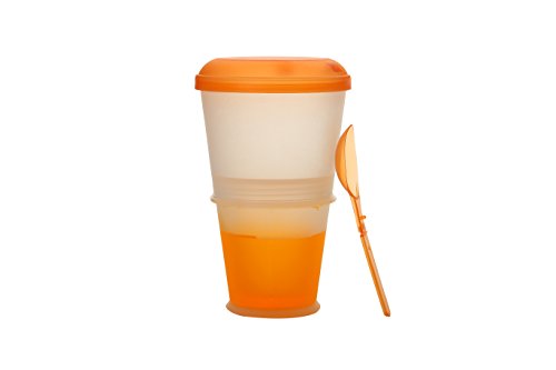 Cereal to go, recipiente per yogurt, latte e cucchiaio, con bicchiere isolato Orange