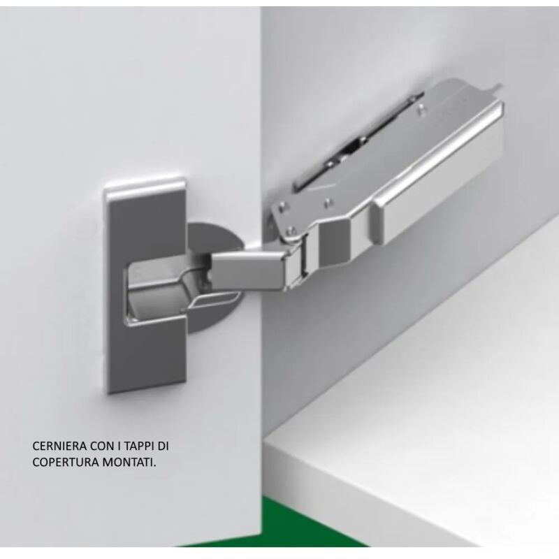 Cerniera con sormonto totale. Gabbia e braccio in acciaio nichelato Regolazione: laterale da -2 a +2 mm in profondità da -2 a +3 mm in altezza +/- 2,5 mm a seconda della base montata Foro nell'anta: 35 mm Profontità foro: 13 mm Sormonto massimo sul fianco: 24 mm Con i tappi di copertura(optional) della gabbia e del braccio si possono mascherare le viti di fissaggio o regolazione,per un design più elegante. Qualità e stabilità certificata LGA EN15570 con 80.000 cicli di chiusura. ATTENZIONE: LA BASETTA E' DA ORDINARE A PARTE con codice HAF-GRASS-BASE.., selezionando l'altezza necessaria (H:-2,H:0,H:+2)
