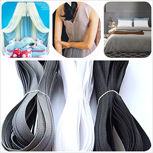 Materiale: nylon resistente e chiusura lampo in metallo. Le cerniere sono molto resistenti, la larghezza della catena e il tessuto della catena è di 2,5 cm. Questo set include 15 metri di cerniera, 5 metri di ogni colore (nero, bianco e grigio chiaro).