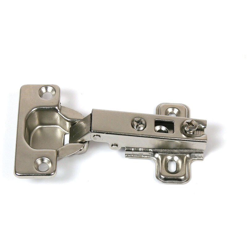 Braccio e scatola in metallo stampato. Montaggio sull'anta con 2 viti. Foro 35 mm, profondità 12 mm. Chiusura automatica. Complete di basetta. Collo 0