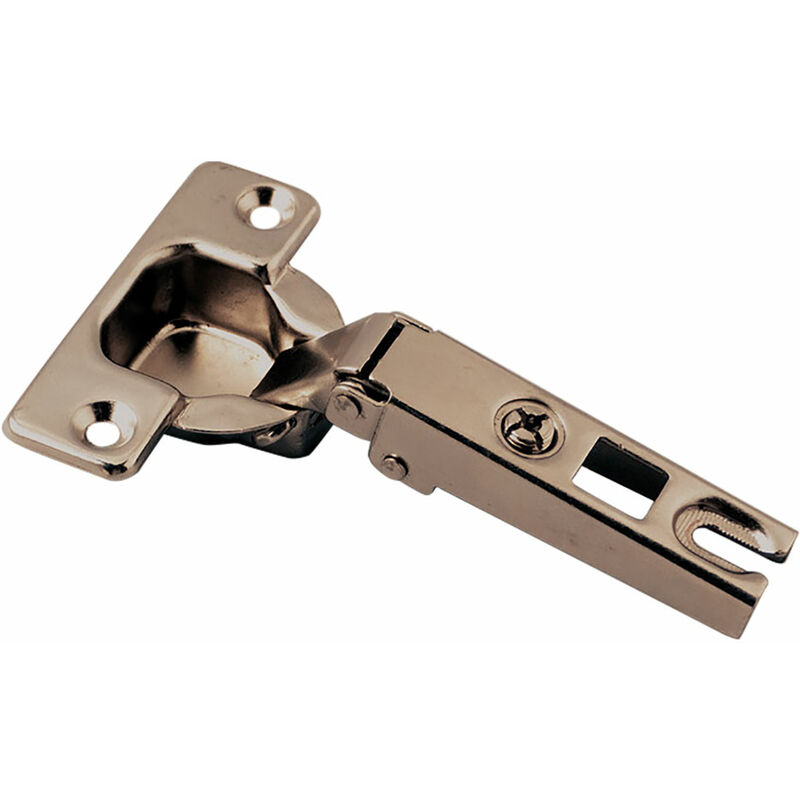 Braccio e scatola in metallo stampato. Chiusura automatica. Apertura 110°. Profondità tazza mm 11,3, diametro tazza mm 35. Fornita con basetta.