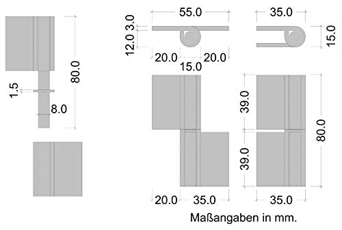 Bobina cerniera Ø: 14 mm - Larghezza aletta: 22 mm - Larghezza totale: 55 mm - Altezza cerniera: 80 mm - Cerniera della porta con perno rinforzato: 8 mm - Spessore: 3 mm