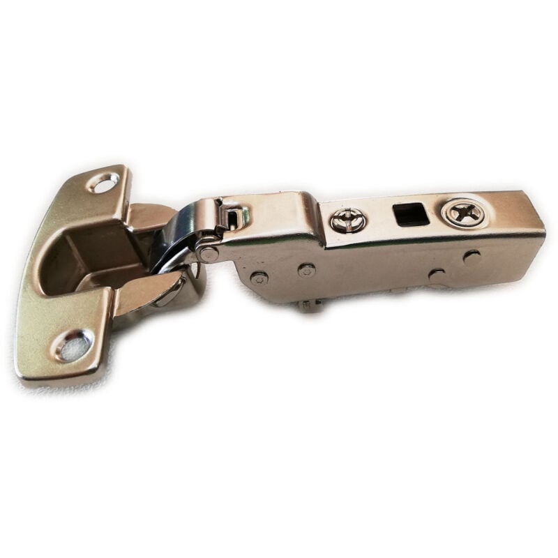 Modello Sensys 8631i - articolo 9090270 Cerniera con molla con montaggio ad avvitare TH 52 e ammortizzatore incorporato Classificazione qualitativa secondo EN 15570, Level 2 Per spessore anta 15 - 32mm Diametro scodellino 35mm Profondità scodellino 12,8mm Regolazione del sormonto incorporata +/- 2mm Regolazione di profondità incorporata +3 / - 2mm Regolazione dell'altezza tramite basetta Materiale braccio e scodellino: acciaio nichelato Angolo di apertura 95°
