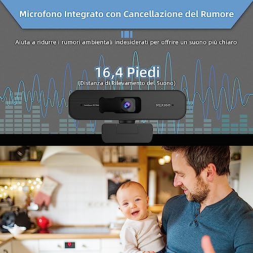 【Autofocus e Microfono Integrato per la Riduzione del Rumore】La webcam NexiGo N940P utilizza la tecnologia di messa a fuoco automatica ad alta sensibilità per catturare e mettere a fuoco rapidamente qualsiasi soggetto. Il microfono con cancellazione del rumore integrato riduce il rumore ambientale per migliorare la qualità del suono del tuo video.